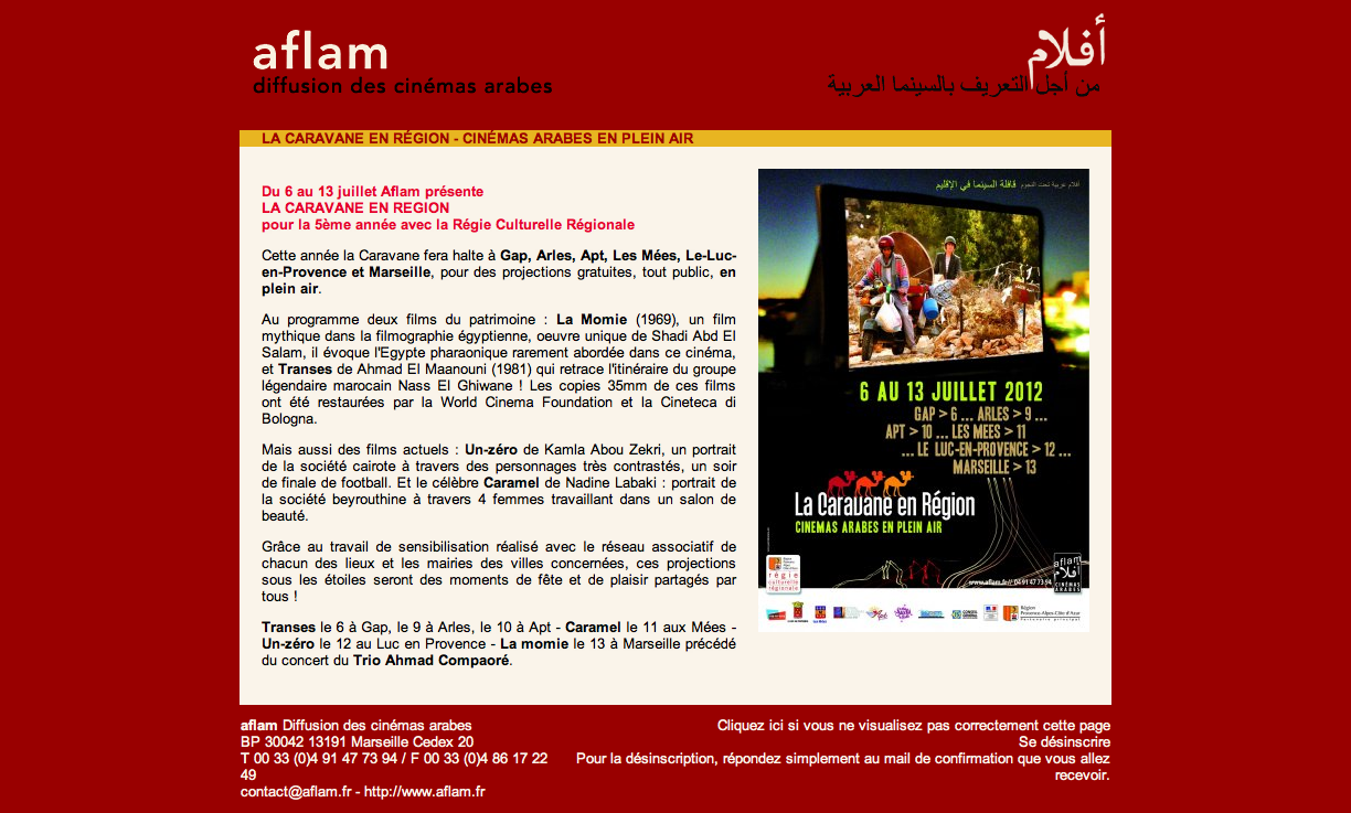 L’association Aflam -que j’ai rencontrée à Cannes au printemps dernier- est née à Marseille en 2000, avec pour vocation de favoriser la diffusion auprès d’un public large -et pas forcément averti- des cinémas arabes. Chaque année, Aflam organise dans la cité phocéenne un festival de cinéma axé sur une problématique ou un pays en particulier. En marge des célébrations de « Marseille-Provence Capitale Européenne de la Culture 2013 » (aka « MP13 » pour les intimes) qui consacrent une grande place au bassin méditerranéen, un premier « Festival des cinémas arabes » sera présenté par l’association à l’automne.