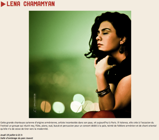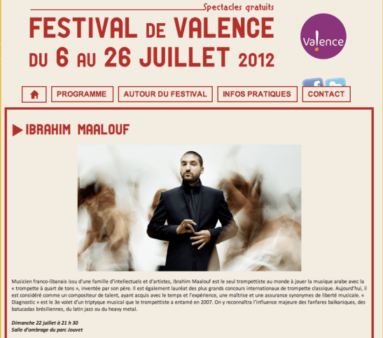 Rhââââââ ! Drame, désespoir, j’ai loupé Lena Chamamyan au Parc Jouvet (Valence, 26) jeudi ! Pénitence et remords éternels ! Bon, toujours est-il que c’est Ibrahim Maalouf qui prend la relève au festival de Valence -l’un des grands rendez-vous de l’été dans la vallée du Rhône, avec ses concerts high-class gratuits à l’ombre du Parc Jouvet-, avec un concert dimanche soir à 21h30. Bon été !
