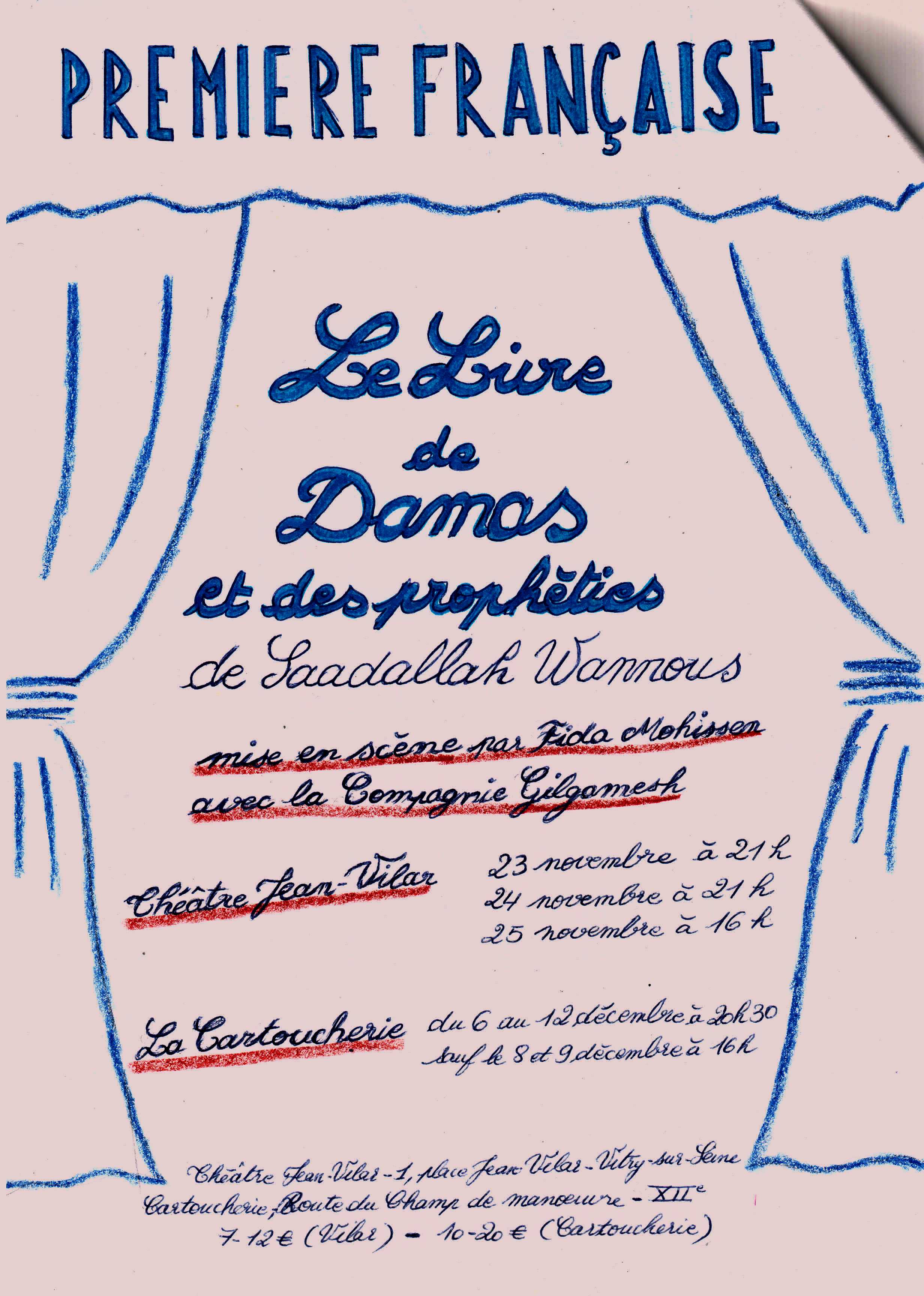 Avant la représentation de samedi 24 novembre une table-ronde sur l’écriture de Saadallah Wannous est organisée au Théâtre Jean-Vilar de 18h30 à 20h00 en présence de Farouk Mardam Bey (Editeur Actes Sud-Sindbad), Dima Wannous (Journaliste au quotidien libanais As-Safir et fille de l’auteur), Rania Samara (Professeur de littérature arabe à l’université Paris 1 Panthéon-Sorbonne et traductrice de l’auteur), Gérard Astor (Directeur du Théâtre Jean-Vilar), Fida Mohissen (Metteur en scène du Livre de Damas et des Prophéties, spécialiste de l’auteur), Ramzi Choucair (Comédien du Livre de Damas et des Prophéties et metteur en scène) et Adel Hakim (Metteur en scène et directeur du Théâtre des Quartiers d’Ivry). Entrée libre sur réservation au 01 55 53 10 60.