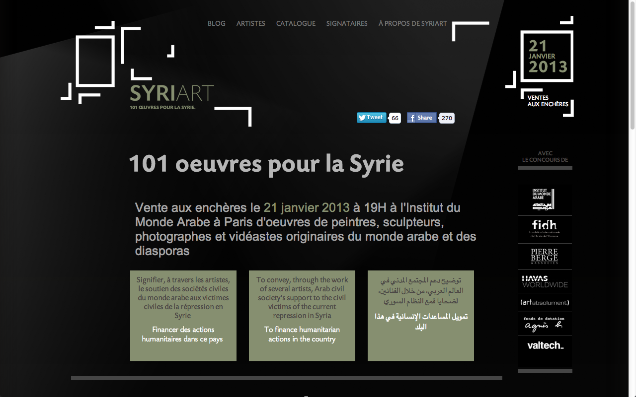 Comment ne rien faire face à la situation en Syrie ? En janvier prochain, l’IMA exposera les œuvres de cinquante artistes qui ont justement décidé de ne pas être impuissants ou silencieux face à une guerre qui a fait 37 000 morts en vingt mois. Tous ont fait don d’une peinture, d’une photo ou d’une vidéo qui sera exposée puis vendue au profit des victimes civiles de la répression en Syrie.Refusant l’indifférence, l’association SyriArt, 101 oeuvres pour la Syrie (loi de 1901), créée pour l’occasion, a mis en oeuvre – en partenariat avec la Fédération internationale des Ligues des droits de l’Homme (FIDH) – le projet de cette vente aux enchères, organisée par la prestigieuse maison de vente Pierre Bergé & Associés, le 21 janvier 2013, dans la salle du Haut Conseil de l’Institut du monde arabe et précédée, du 17 au 20 janvier, de trois jours d’exposition des oeuvres.