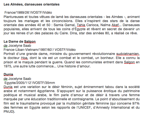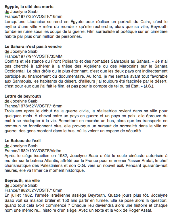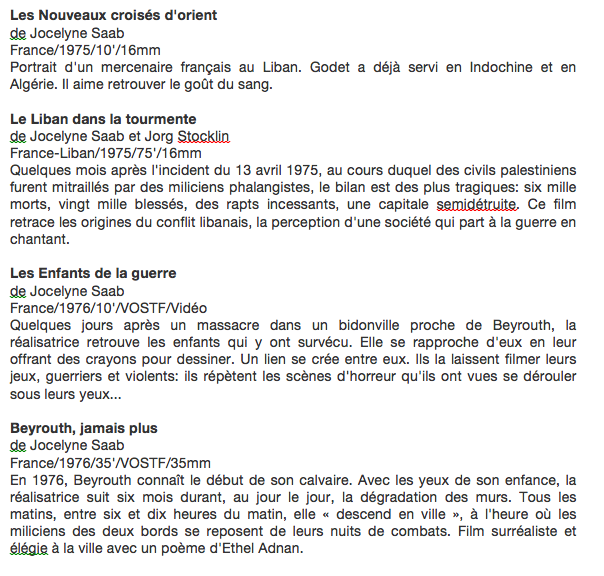 * Rétrospective « Jocelyne Saab » du 29 mars au 24 mai 2013, à la Cinémathèque française, 51 rue de Bercy (XIIe) séances de 3 à 6,5 € (gratuit avec le Pass), billetterie ici, plus d’informations là.
