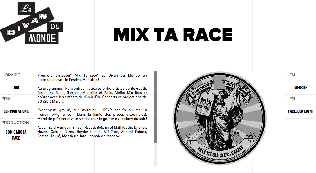 * Première émission « Mix ta race », dimanche 31 mars (goûter de 16h à 19h et concerts/projections de 20h30 à minuit) au Divan du Monde, 75 rue des Martyrs (XVIIIe), tel. 01 40 50 06 99. RSVP par facebook ou par mail à frenchmix@gmail.com.