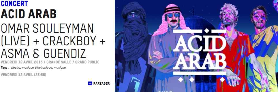 Capture d’écran 2013-04-06 à 23.25.48Acid Arab pour ceux qui ne savent pas (et sont pardonnés) « est le projet de Hervé Carvalho et Guido Minisky, visant à concilier deux styles de musiques à danser: la house des clubs occidentaux et la musique orientale, qui s’est d’ores et déjà frottée à tous les styles de sons électroniques. Le pont est l’acid house, musique de ghettos aux sons saturés et à la richesse rythmique menant le danseur à la transe et répondant à merveille aux enregistrements bruts et crus qu’on entend en Afrique du Nord, en Turquie, au Moyen Orient. Au-delà des soirées et des dj-sets, le duo crée sa propre musique et a entraîné dans son sillage un groupe de producteurs de musique  dans leurs « Collections », une série de disques consacrés à cette tendance ».
