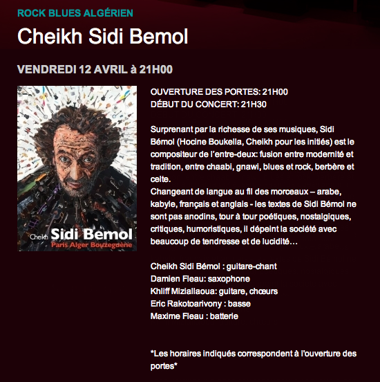 * Concert de Cheikh Sidi Bémol, vendredi 12 avril à 21h30 au Studio de l’Ermitage, 8 rue Ermitage (XXe). Prix: 13 €. Renseignements au 01 44 62 02 86.