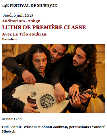 * Concert du Trio Joubran dans le cadre du 14e Festival de Musique « Autour du Oud », jeudi 6 juin à 20h30 à l’Institut du Monde Arabe (Ve). Réservations au 01 40 51 38 14 et sur place.