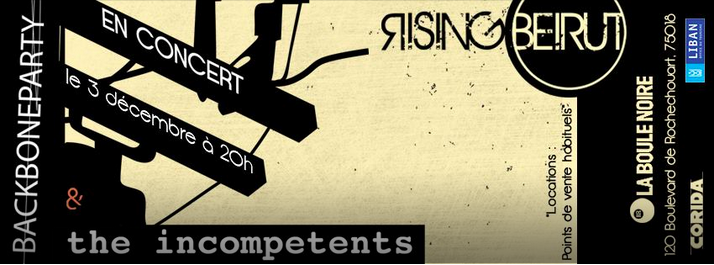 * « Rising Beirut », soirée ticket-double Backbone Party / The Incompetents, mardi 3 décembre à 20h à la Boule Noire, 120 boulevard de Rochechouart (XVIIIe). Page Facebook de l’événement. Vente dans les points de vente habituels (ici par exemple).