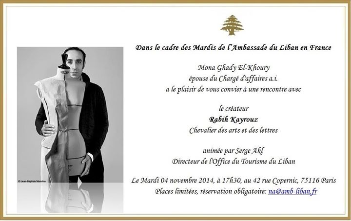 RENCONTRE/MODE. MARDI 4 NOVEMBRE A 17H30. AMBASSADE DU LIBAN. ENTREE LIBRE SUR RESERVATION OBLIGATOIRE. Retrouvez les grandes lignes de la dernière collection de Rabih Kayrouz dans le compte-rendu ustazesque de la Fashion Week ici.