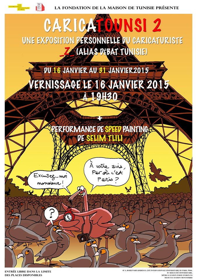 Tel un vengeur masqué on le connais tous sous le pseudonyme : -Z- ( alias Debat Tunisie). Il a pourtant accepté d’exposer dans les locaux de la Fondation de la Maison de Tunisie tout en gardant son anonymat.