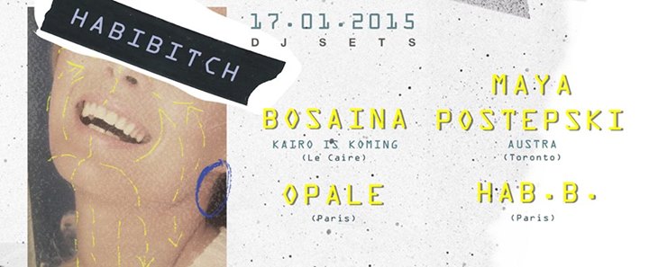 « Le collectif HAB.B. organise pour la première fois à Paris dans le cadre unique et sans chichi du Pipi Caca Poney Club sa soirée HABIBITCH dont l’artiste cairote Bosaina est l’invitée d’honneur. A ses cotés, Maya Postepski (Austra) ainsi que Sophia Hamadi et Rocío Ortiz (Opale). Au plaisir de vous y voir, il n’y a que la fête et la musique qui comptent au Pipi Caca ».