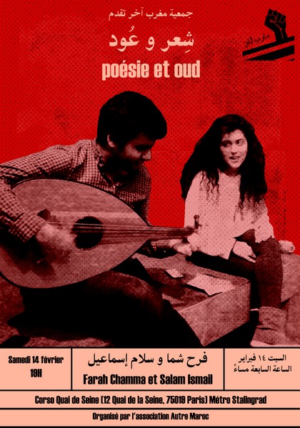 « Une fois n’est pas coutume, l’Association Autre Maroc – مغرب آخر propose un véritable voyage lyrique en compagnie de deux jeunes artistes palestiniens engagés : la poétesse Farah Chamma et le joueur de oud Salam Ismail. Nous vous invitons à partager avec nous ces moments de convivialité autour des vers de Farah et du luth de Salam. Par ailleurs, dans le cadre d’un projet futur, l’Association Autre Maroc organise une collecte de livres de tout type, scolaires, littéraires ou autre, et en toute langue. Aidez nous en faisant don de ce que vous pouvez ! »