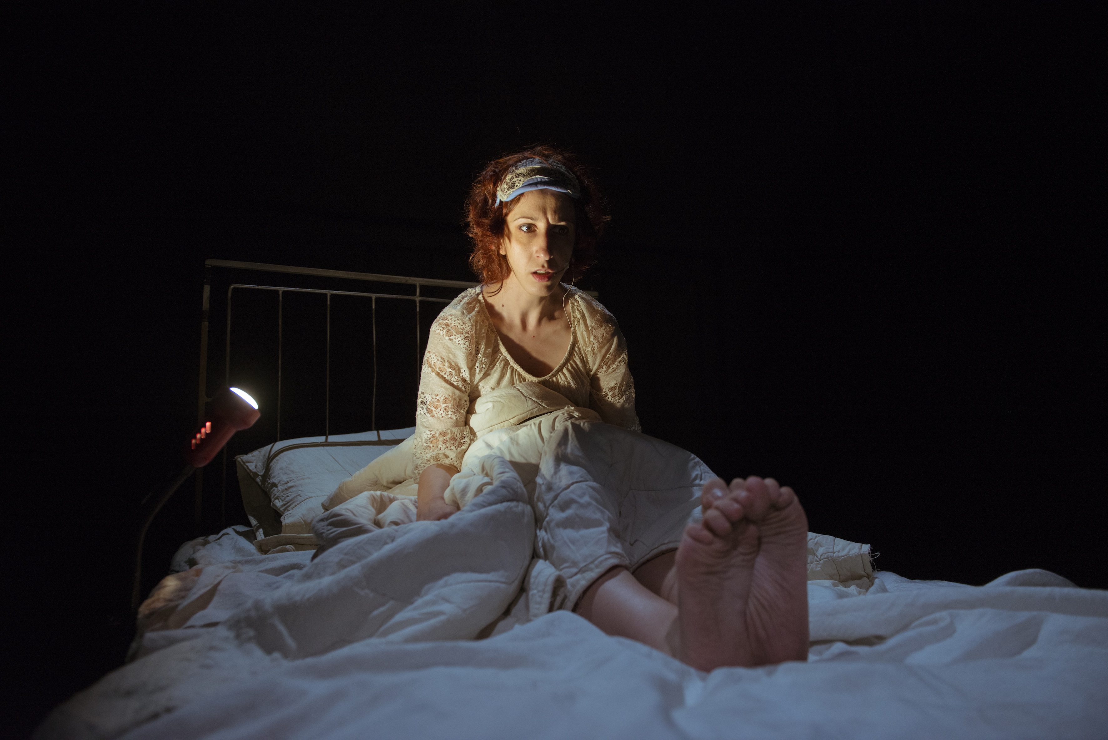 Une jeune femme dans un lit avec des rondelles de concombre sur les yeux… « Contre les rides » dit-elle. Elle les enlève, les mange et éteint la lumière. Son sommeil est agité. Elle a froid aux pieds, elle les réchauffe à la lampe de chevet. Soudain, un troisième pied surgit de la couette. La lumière s’allume toute seule… Un cri. Le trouble et l’absurde se sont immiscés dans la nuit. Elle entame l’inventaire des organes de son corps. Elle invoque Othello et Desdémone. Elle porte un masque au visage d’enfant. Elle implore sa mère : « Maman des fois j’aurais voulu ne jamais être née ». Elle cauchemarde d’un monstre qui transforme en monstre les enfants… Une fois de plus, l’artiste libanaise Sawsan Bou Khaled, associée à son « compagnon de rêve » Hussein Baydoun, nous convie dans son univers, un univers de trouvailles techniques, d’images vidéos, de jeux de lumières et d’artifices, au service d’un imaginaire, d’un monde fantasmagorique peuplé de hantises venues de l’enfance, de la guerre, des peurs installées dans le quotidien. Le château d’Alice/Sawsan, comme celui de Kafka, est une féérie terrible, un désordre intime que l’on raconte avec, sur les épaules, un chat pour ultime confident. Un refuge d’où l’on invente des départs, des lointains imaginaires pour survivre.