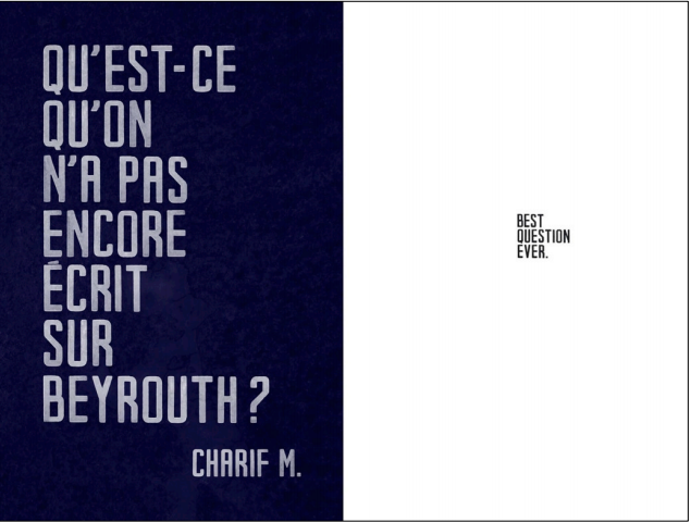 A propos de l’oeuvre : Ce livre personnalise la relation d’une ville à ses habitants, enracinés ou d’adoption, à ses visiteurs de passage et ses inconditionnels. À travers le prisme des émotions, de l’appropriation d’un lieu, du rejet et parfois de la distance que l’on s’impose avec la ville, c’est Beyrouth que l’on découvre. Mais cela pourrait tout aussi bien être Paris, Bruxelles, New York, Berlin… Ce premier ouvrage marque d’ailleurs le début d’une série de livres sur ces villes tour à tour vibrantes, captivantes, repoussantes. David Dury retrace la genèse du livre en expliquant que « The Beirut book est issu d’une série d’illustrations s’inspirant des plaques bleues émaillées que l’on croise au coin des rues de Beyrouth. (…) A l’origine, ces illustrations s’appuyaient sur une idée simple : détourner des citations célèbres en y intégrant le mot de Beyrouth. » David Hury a repris l’idée de ce détournement pour en faire un activité ludique pendant le Salon du livre francophone de Beyrouth 2013. Inconnus, célébrités locales, auteurs, visiteurs de passage se sont tous prêtés au jeu, en plusieurs langues parfois, mais toujours inspirés. C’est ainsi que The Beirut book est né.