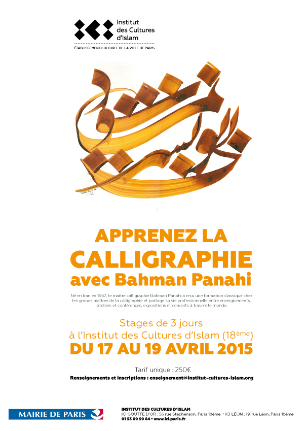 STAGE/CALLIGRAPHIE. DU 17 AU 19 AVRIL 2015. INSTITUT DES CULTURES D’ISLAM (XVIIIe). 250 €. RESERVATIONS ET RENSEIGNEMENTS SUR ENSEIGNEMENT@INSTITUT-CULTURES-ISLAM.ORG