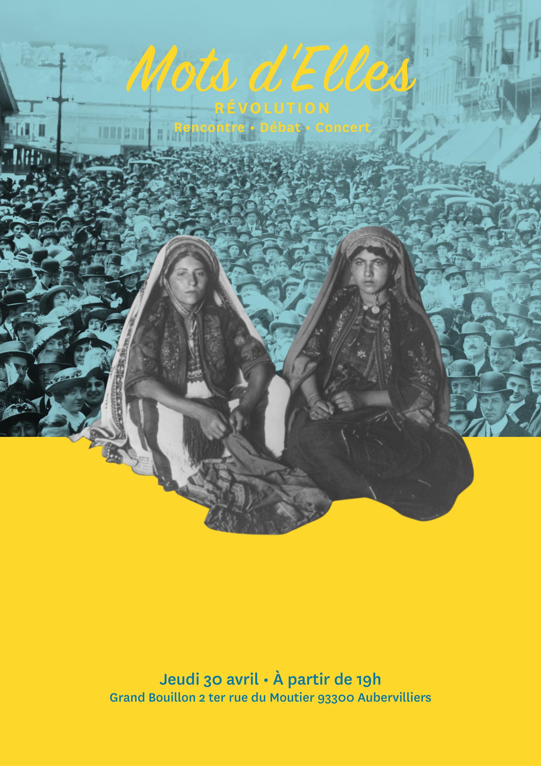 Dans le cadre de « MOTS D’ELLES », festival littéraire et artistique sur la création des femmes dans le monde arabe, le café culturel Le Grand Bouillon accueille « Mots d’elles : Révolution », une rencontre avec l’auteur Asma Guenifi (auteure de « Je ne pardonne pas aux assassins de mon frère » et présidente de l’association « Ni Putes Ni Soumises ») et l’artiste plasticienne Moufida Fedhila (également poète et vidéaste) suivie d’un concert de la chanteuse Nawel Ben Kraiem.