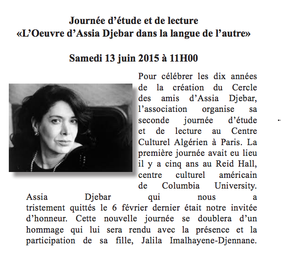 LITTERATURE. SAMEDI 13 JUIN 2015 A 11H. CENTRE CULTUREL ALGERIEN (171 RUE DE LA CROIX NIVERT, XVe).